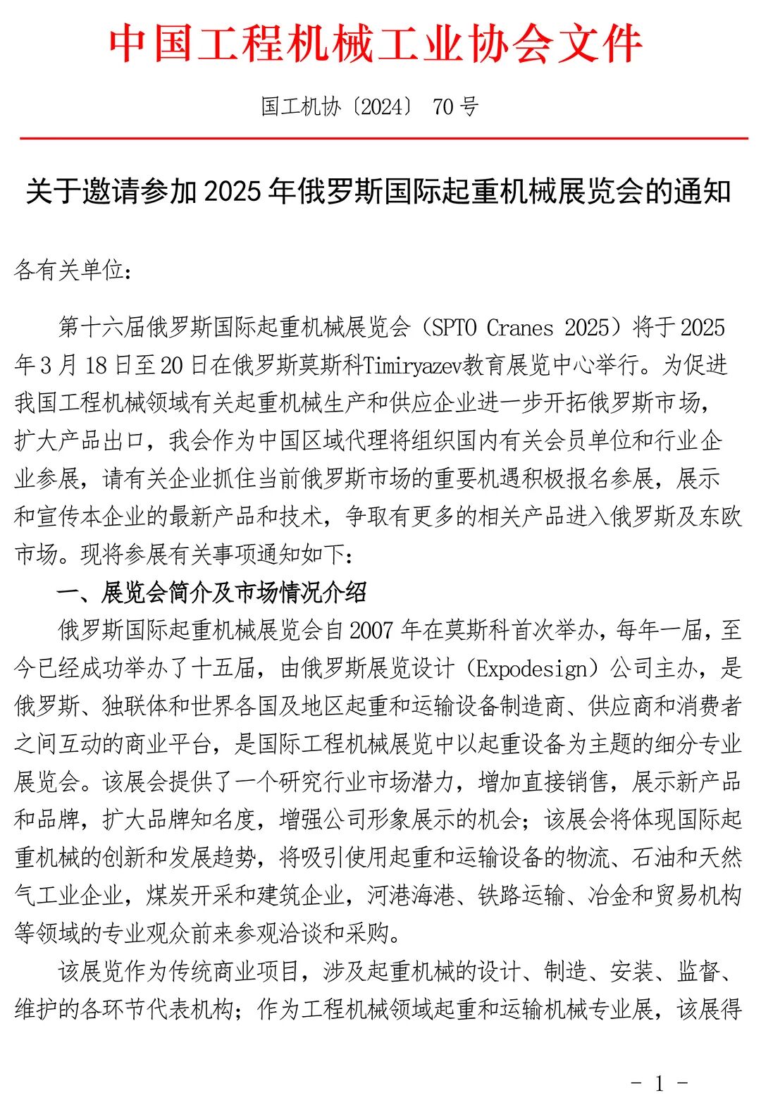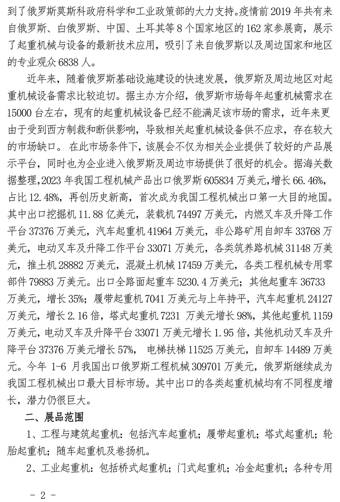 第十六届俄罗斯国际起重机械展览会(SPTO Cranes 2025)将于2025年3月18—20日在俄罗斯莫斯科Timiryazev教育展览中心举行。为促进我国工程机械领域有关起重机械生产和供应企业进一步开拓俄罗斯市场,扩大产品出口,我会作为中国区域代理将组织国内有关会员单位和行业企业参展,请有关企业抓住当前俄罗斯市场的重要机遇积极报名参展,展示和宣传本企业的最新产品和技术,争取有更多的相关产品进入俄罗斯及东欧市场。现将参展有关事项通知如下:俄罗斯国际起重机械展览会自2007年在莫斯科首次举办,每年一届,至今已经成功举办了十五届,由俄罗斯展览设计(Expodesign)公司主办,是俄罗斯、独联体和世界各国及地区起重和运输设备制造商、供应商和消费者之间互动的商业平台,是国际工程机械展览中以起重设备为主题的细分专业展览会。该展会提供了一个研究行业市场潜力,增加直接销售,展示新产品和品牌,扩大品牌知名度,增强公司形象展示的机会;该展会将体现国际起重机械的创新和发展趋势,将吸引使用起重和运输设备的物流、石油和天然气工业企业,煤炭开采和建筑企业,河港海港、铁路运输、冶金和贸易机构等领域的专业观众前来参观洽谈和采购。该展览作为传统商业项目,涉及起重机械的设计、制造、安装、监督、维护的各环节代表机构;作为工程机械领域起重和运输机械专业展,该展得到了俄罗斯莫斯科政府科学和工业政策部的大力支持。疫情前2019年共有来自俄罗斯、白俄罗斯、中国、土耳其等8个国家地区的162家参展商,展示了起重机械与设备的最新技术应用,吸引了来自俄罗斯以及周边国家和地区的专业观众6838人。近年来,随着俄罗斯基础设施建设的快速发展,俄罗斯及周边地区对起重机械设备需求比较迫切。据主办方介绍,俄罗斯市场每年起重机械需求在15000台左右,现有的起重机械设备已经不能满足该市场的需求,近年来更由于受到西方制裁和断供影响,导致相关起重机械设备供不应求,存在较大的市场缺口。在此市场条件下,该展会不仅为相关企业提供了较好的产品展示平台,同时也为企业进入俄罗斯及周边市场提供了很好的机会。据海关数据整理,2023年我国工程机械产品出口俄罗斯605834万美元,增长66.46%,占比12.48%,再创历史新高,首次成为我国工程机械出口第一大目的地国。其中出口挖掘机11.88亿美元,装载机74497万美元,内燃叉车及升降工作平台37376万美元,汽车起重机41964万美元,非公路矿用自卸车33768万美元,电动叉车及升降工作平台33071万美元,各类筑养路机械31148万美元,推土机28882万美元,混凝土机械17459万美元,各类工程机械专用零部件79883万美元。出口全路面起重车5230.4万美元;其他起重车36733万美元,增长35%;履带起重机7041万美元与上年持平,汽车起重机24127万美元,增长2.16倍,塔式起重机7231 万美元增长98%,其他起重机1159万美元,电动叉车及升降平台33071万美元增长1.95倍,其他机动叉车及升降平台37376万美元增长57%, 电梯扶梯11525万美元,自卸车14489万美元。今年 1-6 月我国出口俄罗斯工程机械309701万美元,俄罗斯继续成为我国工程机械出口最大目标市场。其中出口的各类起重机械均有不同程度增长,潜力仍很巨大。1. 工程与建筑起重机:包括汽车起重机;履带起重机;塔式起重机;轮胎起重机;随车起重机及卷扬机。2. 工业起重机:包括桥式起重机;门式起重机;冶金起重机;各种专用起重机。3. 港口起重机:包括岸边集装箱起重机;场地集装箱起重机;门座起重机;高架轮胎起重机;集装箱正面起重机;集装箱跨运起重机及散料装卸机。4. 高空作业平台:包括高空作业平台、高空消防车、自行式高空作业车;车载式高空作业车。5. 电梯:包括各种电梯、自动扶梯、自动人行道等。6. 工业车辆:包括电动叉车和其他机动叉车, 堆垛机,AGV小车。以实物为主,辅以图片、模型、样本等。可租用标准展位展出,也可根据企业的要求租用光地并对展位进行特殊装修。重点组织有外贸进出口资质的会员单位和行业生产企业参展,严禁携带假冒伪劣、侵犯他人知识产权及商标权行为的产品参展。