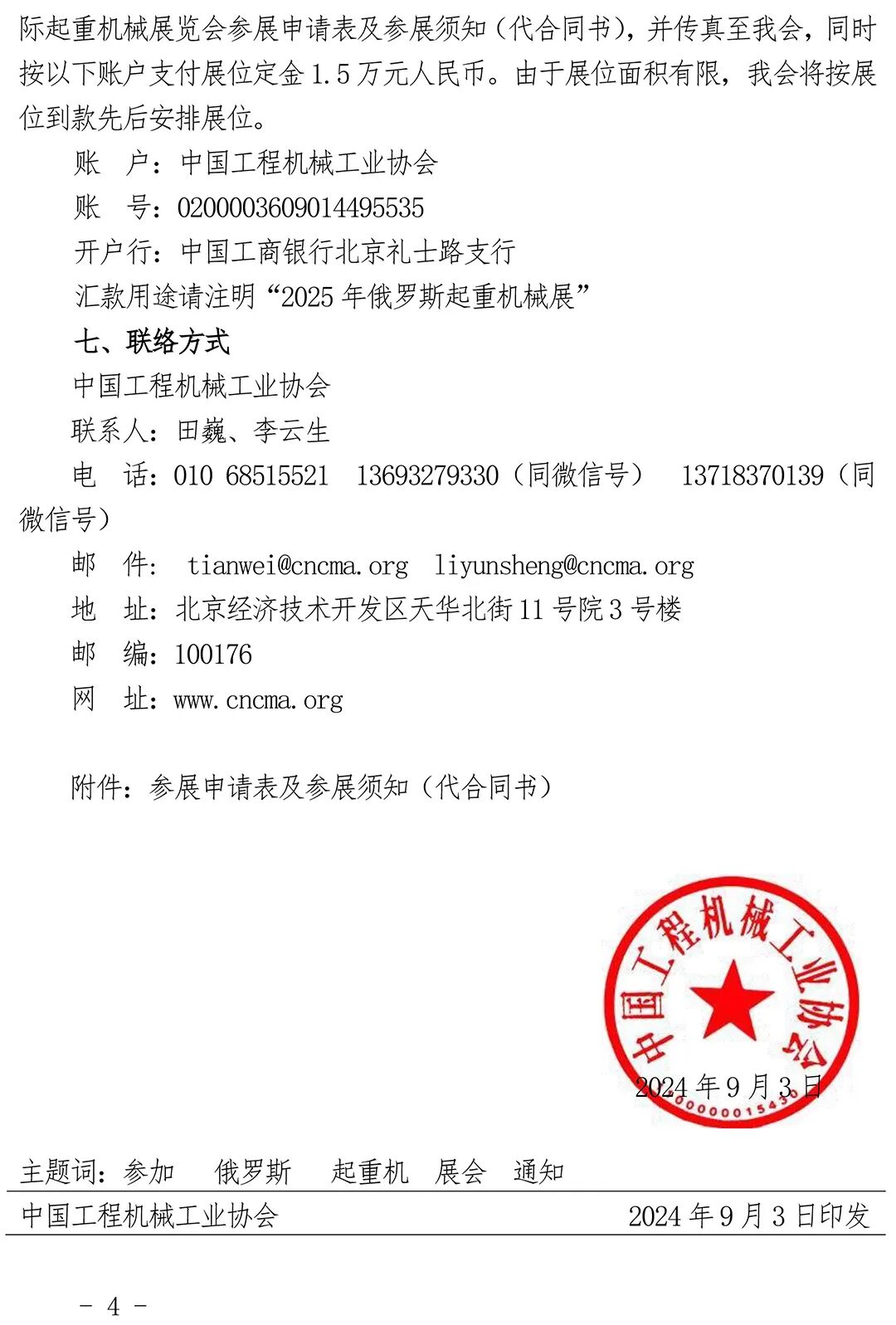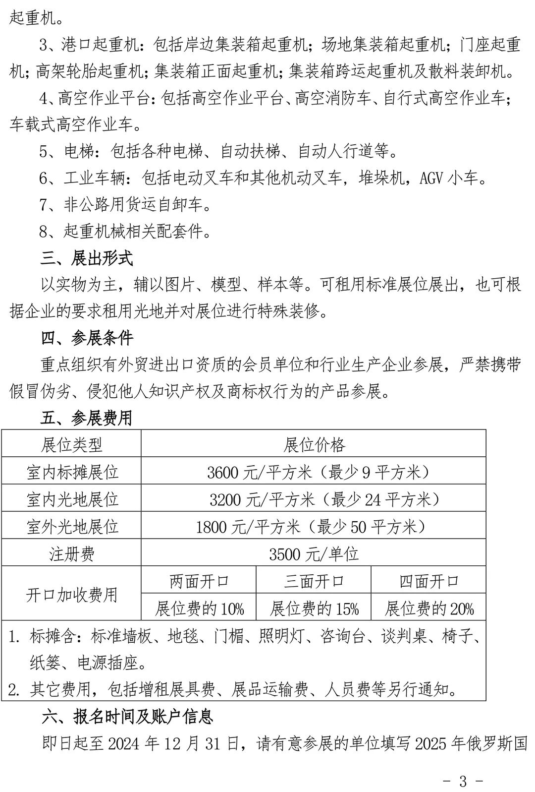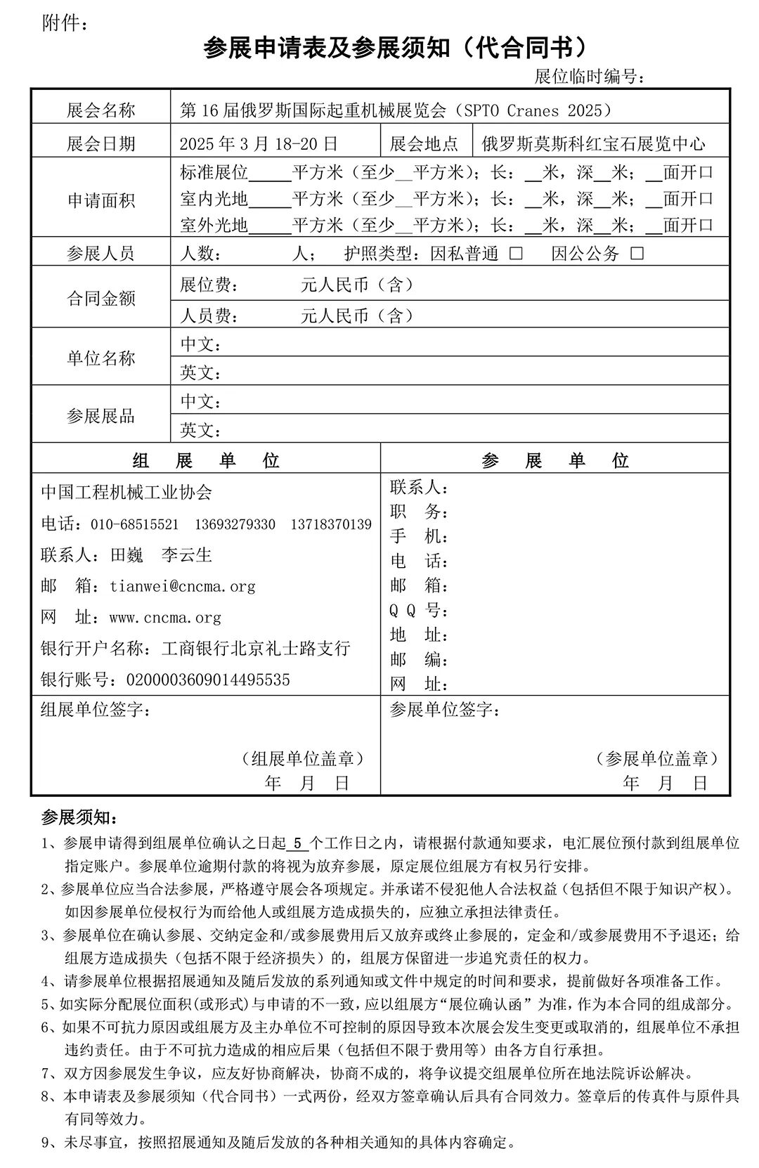 即日起至2024年12月30日,请有意参展的单位填写2025年俄罗斯国际起重机械展览会参展申请表及参展须知(代合同书),并传真至我会,同时按以下账户支付展位定金1.5万元人民币。由于展位面积有限,我会将按展位到款先后安排展位。