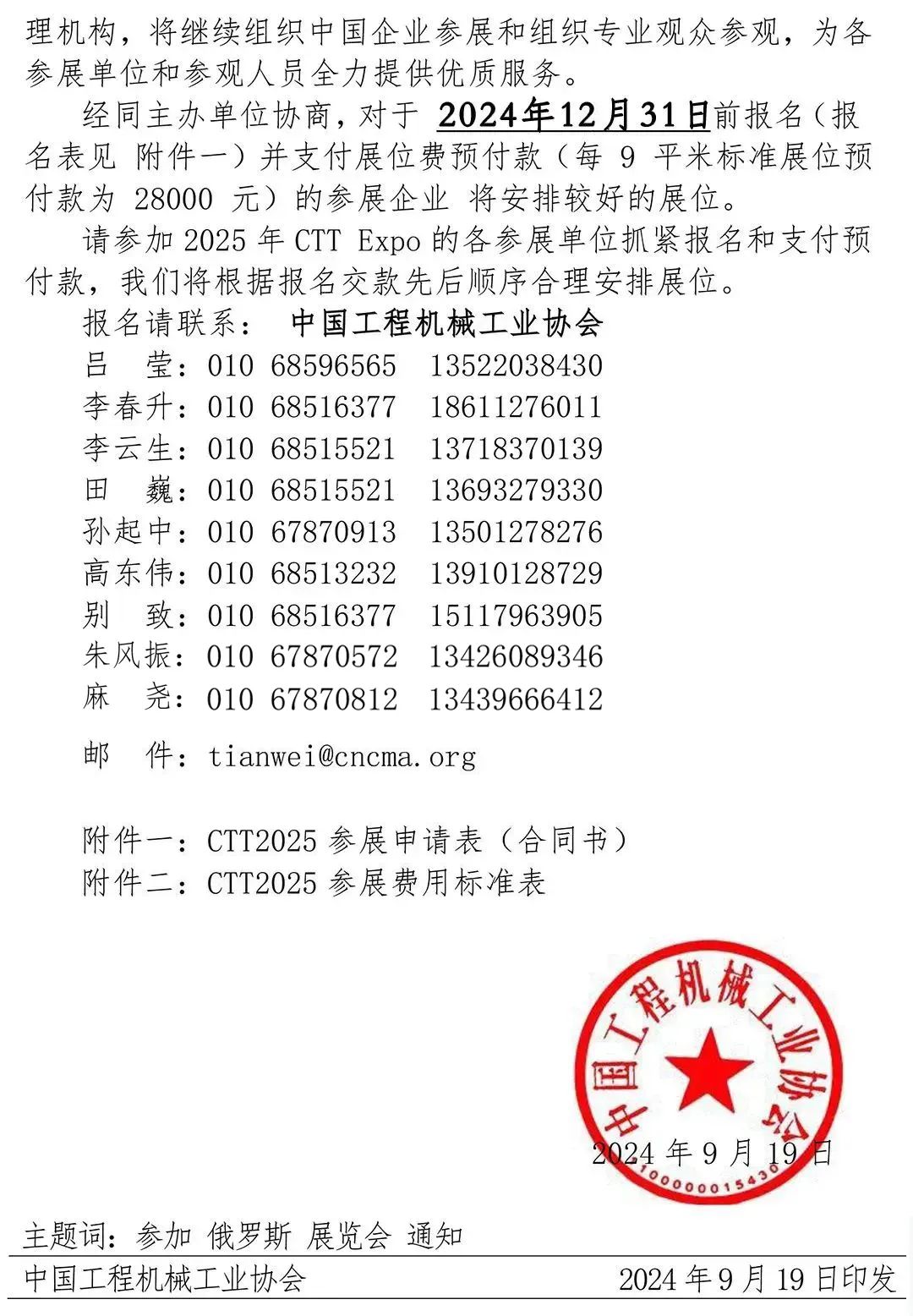关于参加俄罗斯国际建筑及工程机械展览会的紧急通知(CTT Expo 2025)